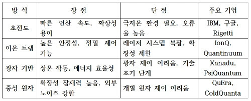 - 광자 기반 : 광자를 정보 매개체로 사용하는 방식으로, 상온에서 동작해 냉각 비용 문제를 완화할 수 있다. 그러나 광학 소자와 광자 간 상호작용을 정밀 제어하는 기술이 아직 초기 단계이다.