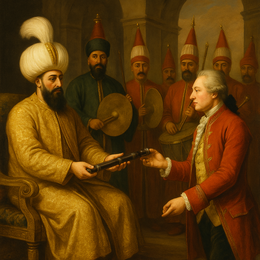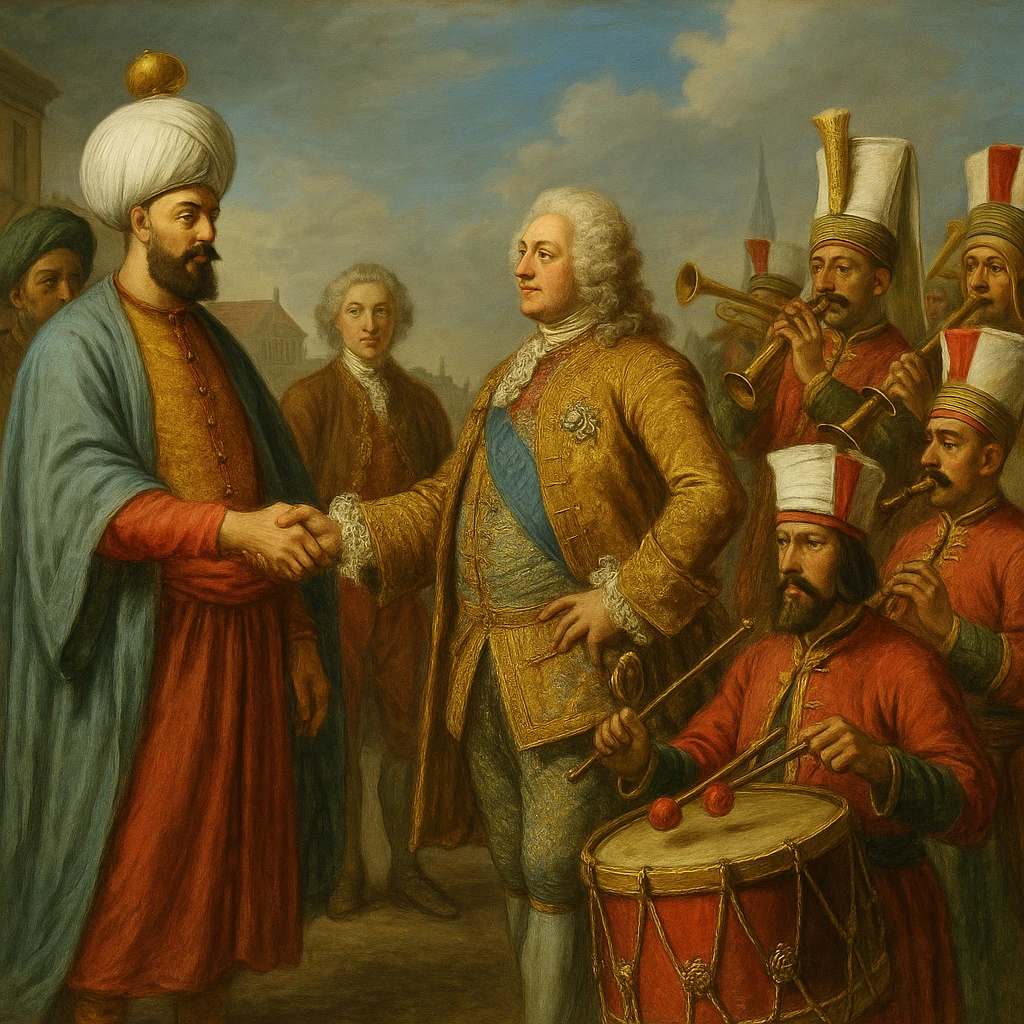 이 메흐테르 군악대는 오스만 제국의 문화를 과시하는 외교적 도구로도 활용되었습니다. 오스만 술탄은 18세기 초 폴란드의 아우구스투스 2세에게 터키 군악대를 선물했고, 당시에는 악기뿐 아니라 연주자 12~15명까지 함께 보내졌다고 알려져 있습니다. 이후 러시아에서는 1725년 이스탄불에 사람을 보내 유사한 군악대를 요청하였고, 오스트리아 빈에서는 1741년부터 터키풍 군악을 정규 연주에 도입합니다. 18세기 후반에는 영국도 이를 수용하게 됩니다.