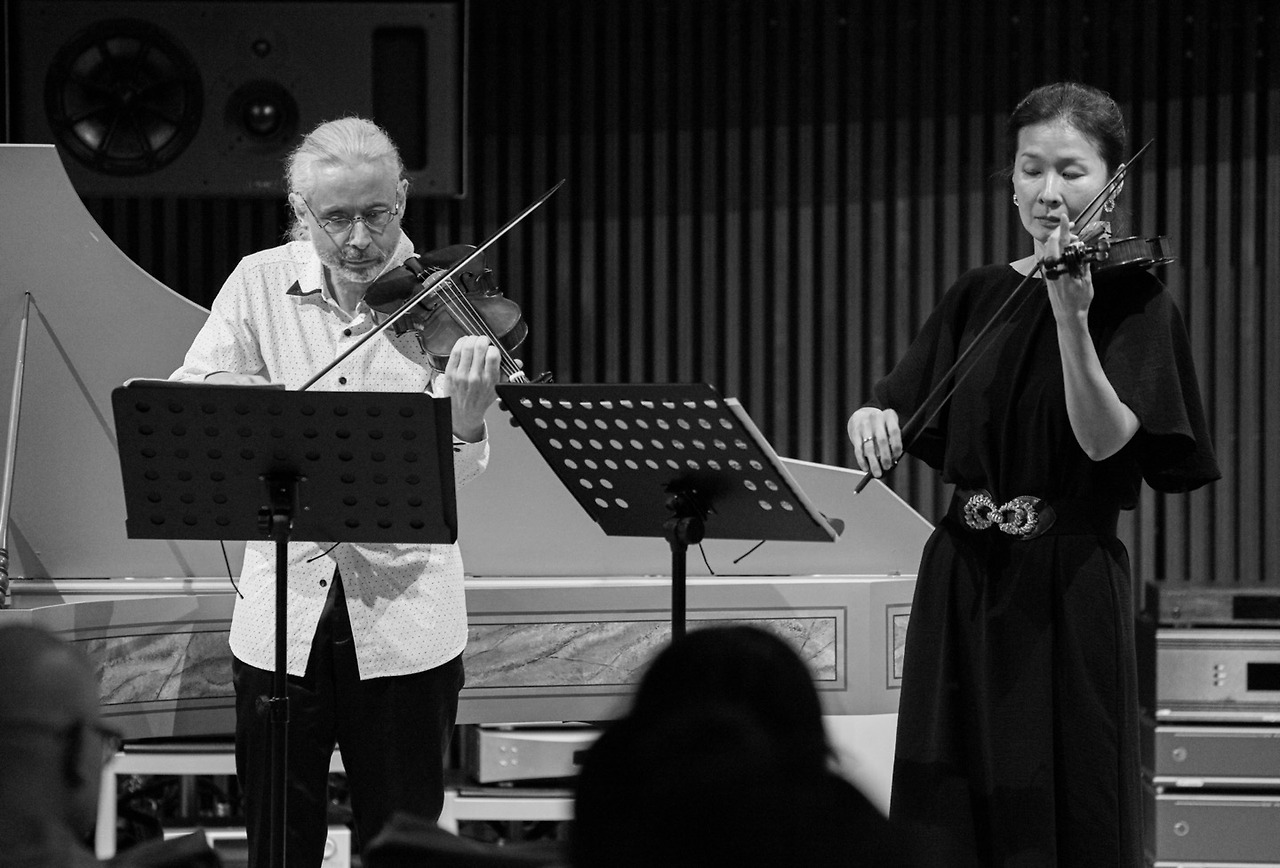 그리고 바이올리니스트 프랑수아 페르난데즈 선생님과 김윤경 선생님을 처음 뵈었을 때 환히 웃어주시던 모습이 아직도 생생하다. 하프시코드가 완성되고 튜닝이 시작되자, 곧이은 A음은 이곳을 단숨에 바로크 궁정으로 바꿔놓은 듯했다. 그 소리는 단순한 기준음이 아니라, 과거로 향하는 문을 여는 열쇠였다. 이어지는 현의 조율 하나하나는 시간을 거꾸로 되돌리는 의식처럼 들렸다. 현대식 건물의 차가운 콘크리트 벽도, 그 순간만큼은 오래된 궁정의 살롱으로 변해 있었다. 뒤이어 김윤경 선생님의 소리가 더해지자, 그 작은 울림은 곧 서로의 선율을 끌어안으며 하나의 공간을 채워나갔다. 두 음이 교차하는 순간, 지금 이곳은 단순한 리허설 무대가 아니었다. 현재와 과거가 겹쳐지는 층위 위에서, 우리는 이미 음악의 한가운데에 들어와 있었다.