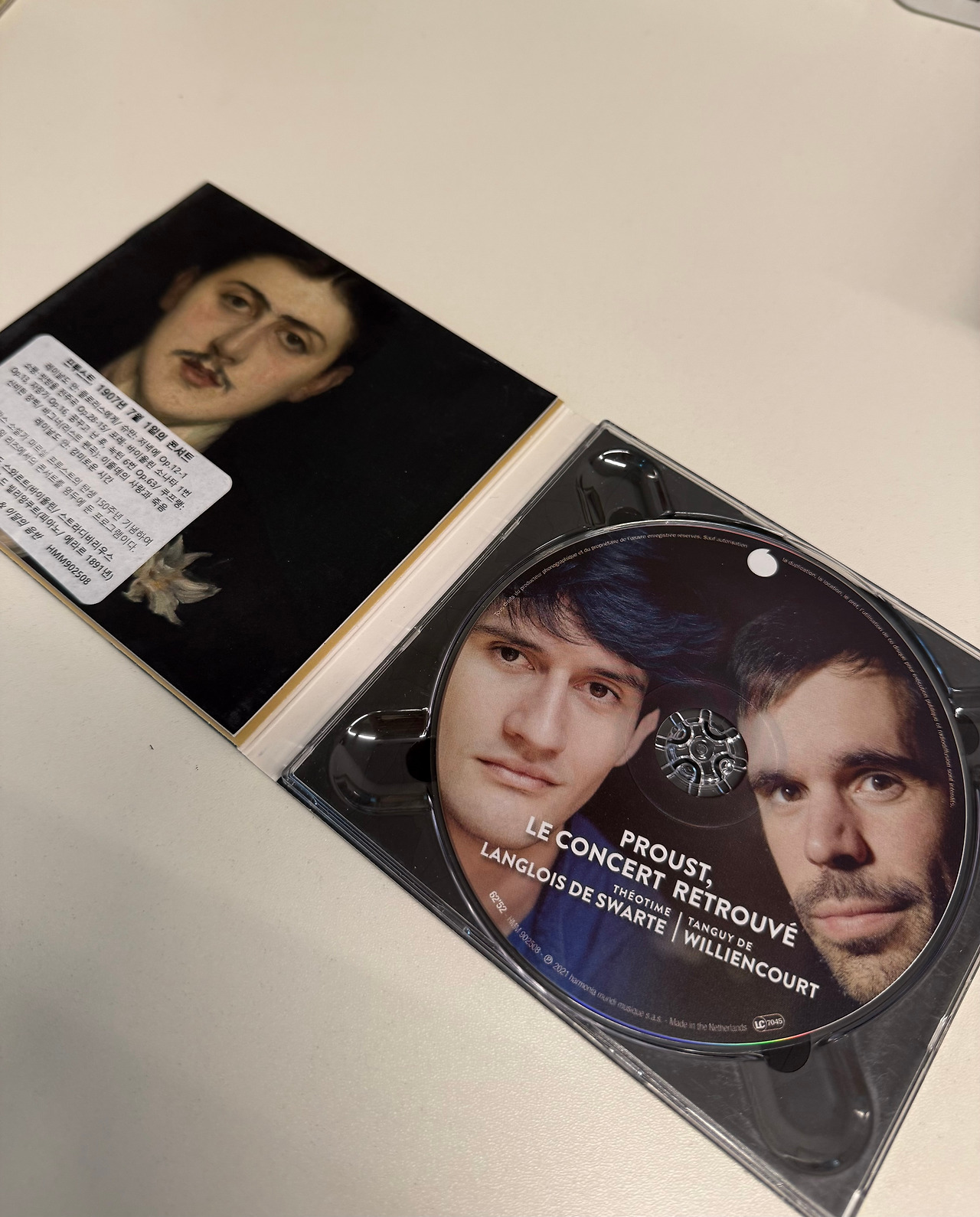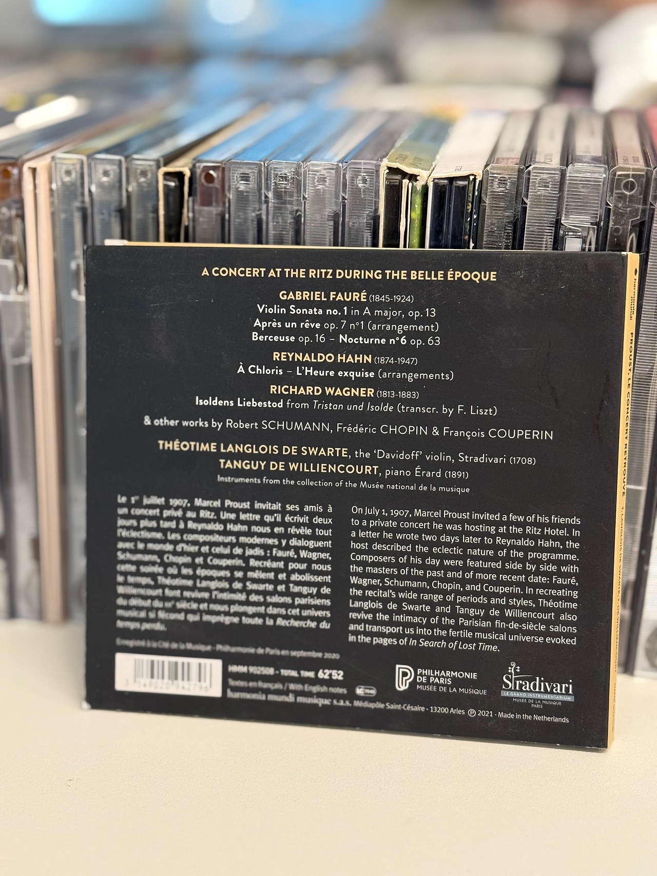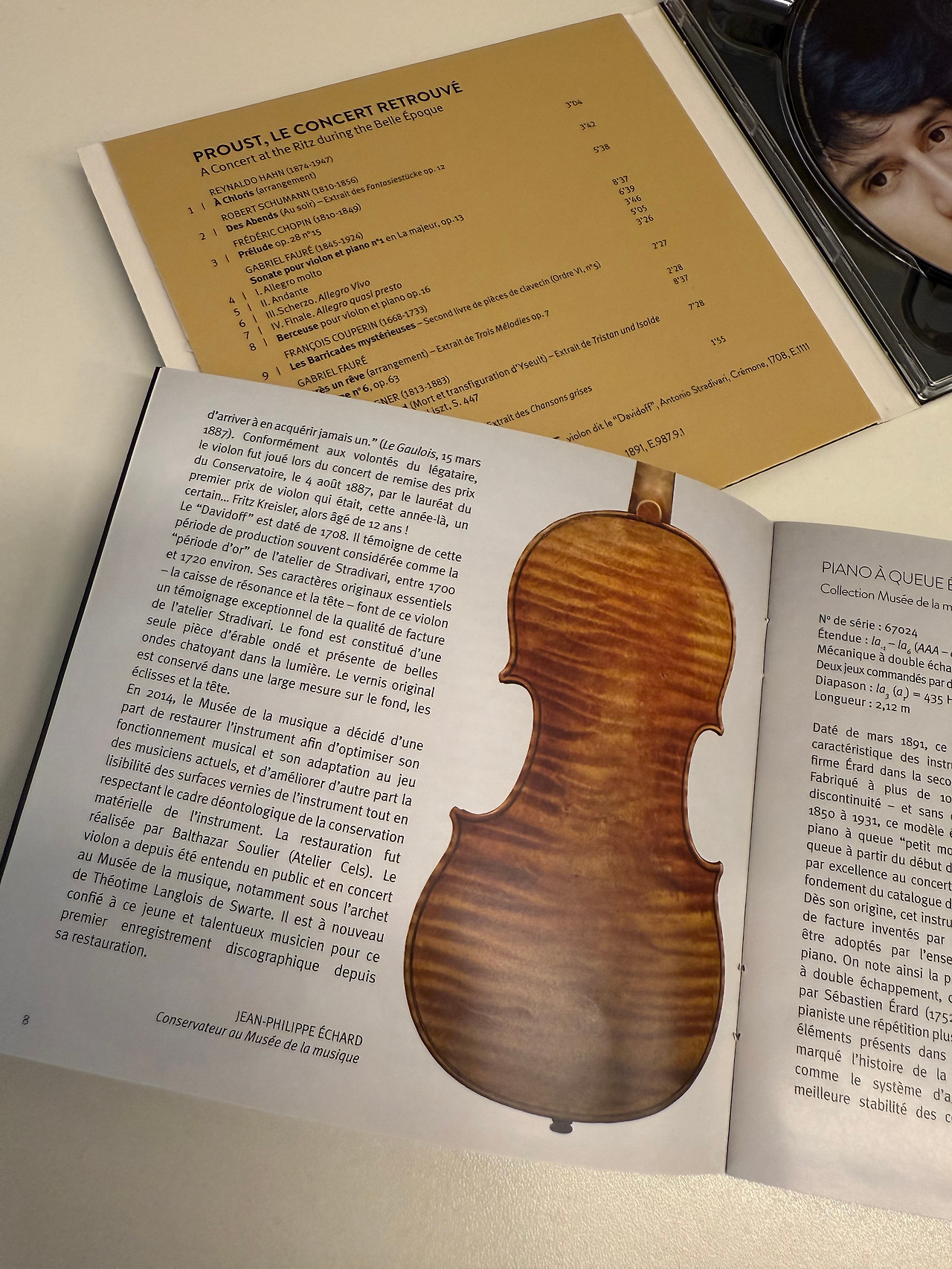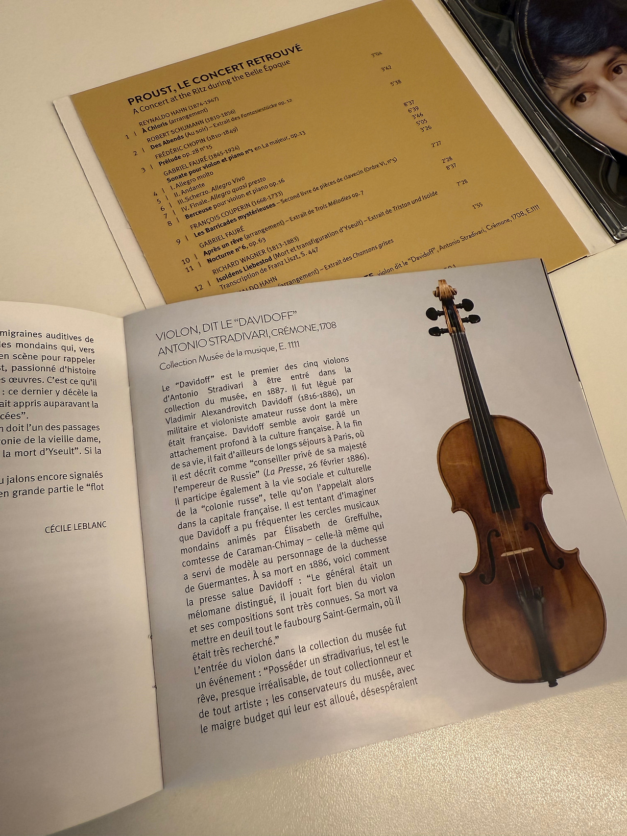 이 음반은 단순히 한 장의 연주 기록이 아니라, 프루스트의 삶과 문학적 세계를 지탱했던 한 시절의 공기를 다시 불러내는 시도다. 1907년 리츠 호텔의 음악회가 그렇듯, 여기서 들리는 음악은 단순한 프로그램이 아니라 노스텔지아와 실험실 같은 의미를 지닌다. 연주자들이 손에 쥔 악기 또한 특별하다. 오랜 세월을 건너 복원된 스트라디바리우스 “다비도프”와 에라르 피아노는, 당대의 숨결을 지금 우리 앞에 되살려주며 시간의 간극을 메운다. 무엇보다 중심에 놓인 포레의 바이올린 소나타는 프루스트가 소설 속에서 ‘방퇴유의 소나타’로 변주해낸 작품으로, 음악과 문학이 서로에게 길을 내어주는 순간을 증언한다.