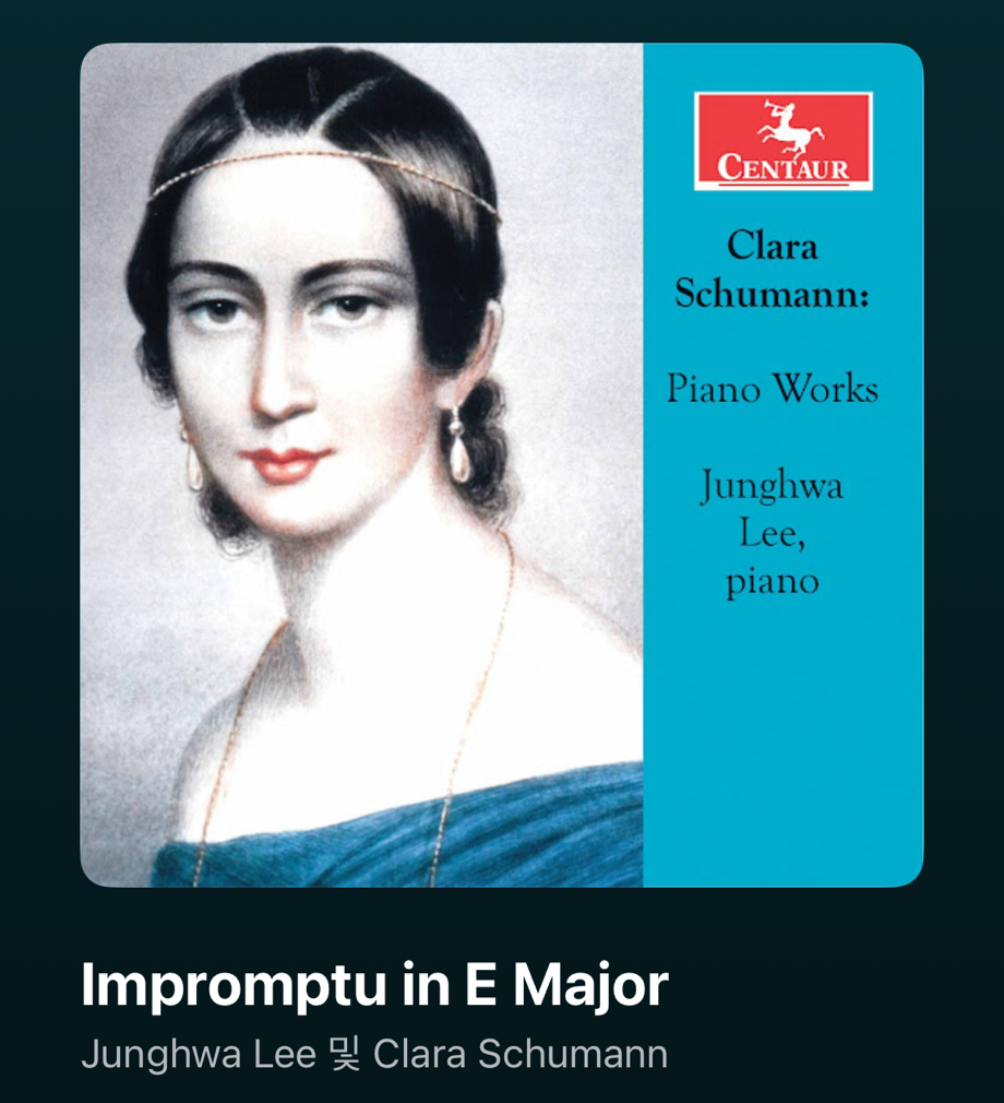 또 하나는 한국 피아니스트 이정화의 앨범으로 수록 곡 'Impromptu in E major'은 impromptu 프랑스어로 즉흥곡이라는 뜻으로 즉흥처럼 들리지만 정교하게 구성된 짧은 피아노 소품곡이며, 클라라 슈만 초기의 (1836년경 작곡) 서정성과 깊은 내면적 정서를 담고 있는 아름다운 곡이다. 마치 물 위에 떠있는 백조처럼 고고한 선율과 그 밑에 바쁘게 헤엄치는 듯한 아르페지오가 꼭 추천하고 싶은 곡이다.