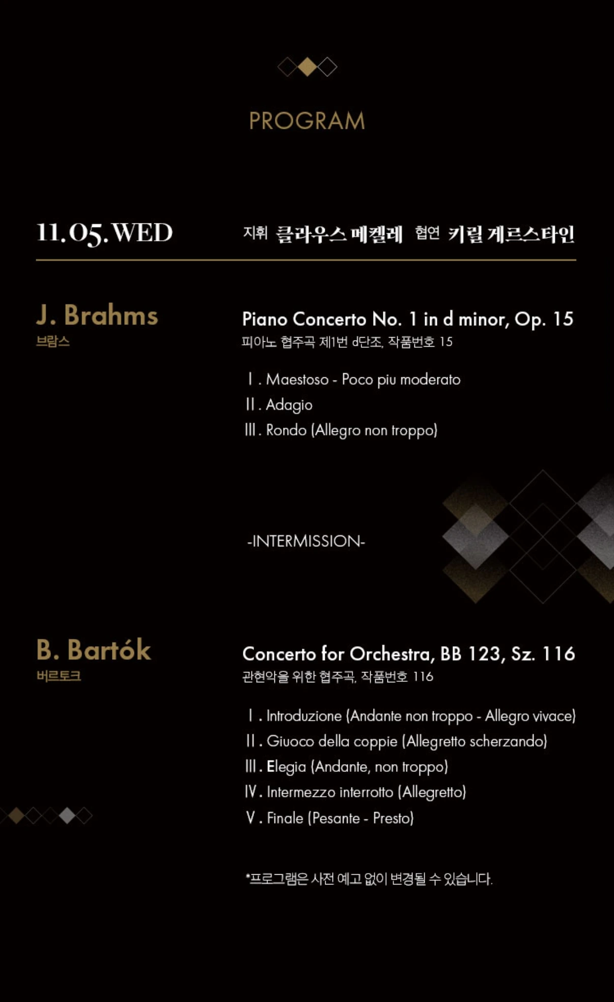 클라우스 메켈레와 네덜란드 왕립 콘세르트헤바우 오케스트라는 올해 11월, 아시아 투어의 일환으로 한국을 찾았다. 11월 5일 예술의 전당을 시작으로, 6일 롯데콘서트홀, 9일 부산콘서트홀까지 단 세 번의 무대로 한국 청중과 만나는 일정이었다. 내가 본 공연은 그 서막을 알리는 아시아 투어의 첫날, 11월 5일 공연이었다. 세계가 주목하는 젊은 지휘자와 전통의 오케스트라가 만들어낸 첫 공연은 그 자체로 시작이자 마침표처럼 느껴졌다. 브람스 피아노협주곡 1번 d단조와 버르토크 관현악을 위한 협주곡, 작품번호 116. 젊은 브람스와 말년의 버르토크의 작품들이다. 서로 다른 세기를 살았지만 두 거장의 궤적은 묘하게 닮아있다.