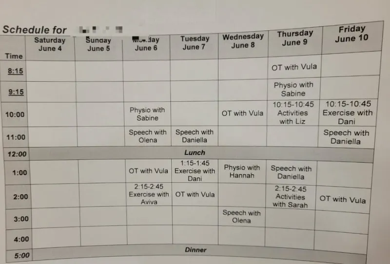 목요일에 재활 병원에 도착하자마자 정확하게 기억은 안 나지만 병원 센터장님이 이런저런 설명을 해주시고, 각 분야의 재활 선생님과 만나며 어떤 일정으로 진행될 것인지 설명을 들었다. 작업, 물리, 언어치료를 받아야 하며 각 수업별로 보조 일정까지 있어 주중 총 15~18개 정도의 대면 수업을 들었어야 했다. 대학생 때도 이렇게 열심히 안 했던 거 같은데… 보통 하루에 45분 분량 정도의 수업이 3~4개 정도 잡혀있었고 체력적으로 많이 약해져 있던 상태라 걱정이 앞섰다. 작업치료는 장애를 가진 환자들이 일상생활로 복귀하기 위한 치료를 하는데, 치료 시작 전 어떤 성향의 사람인지, 독립적인지 의존적인지, 외향적인지 내향적인지부터 집안일 빈도수 등 다양하게 물어본다. 물리치료는 정말 재밌었다. 빨래 들고 걷기, 계단 오르기 같은 기본적인 거부터 시작해 나중에는 운동할 시간을 따로 줬다. 뇌 수술을 해 말이나 기억력은 안 좋아졌어도 운동은 기억하는 게 신기했달까. 반면, 언어 치료는 정말 힘들었다. 모국어인 한국어도 버겁게 됐는데, 영어는 오죽할까. 캐나다에 비교적 늦게 유학 와서 잘 못해도 어렵게 배운 영어인데 정말 억울해 미치는 줄 알았다.