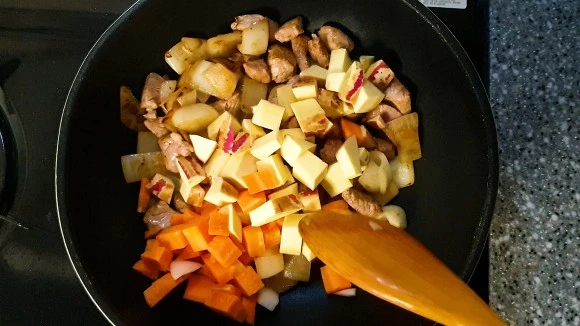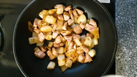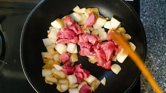 4. 돼지고기 안심을 넣고 마이야르 반응(갈색)이 날 때까지 볶아준다. 고기의 맛을 더욱 살릴 수 있다. 재료를 잘 볶아주는 것이 이번 카레 레시피의 핵심이다.