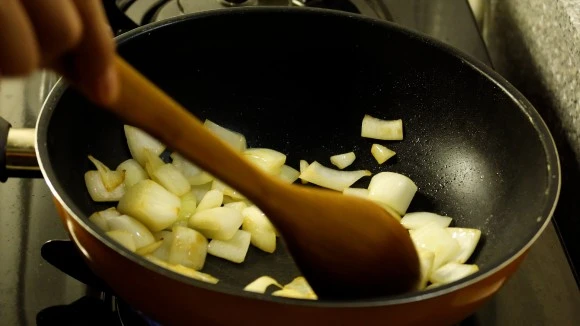 3. 양파를 넣어 노릇노릇 색이 진해질 때까지 오래 볶아 준다. 충분히 볶아주면 단맛과 감칠맛이 배가 된다.