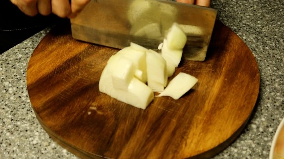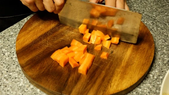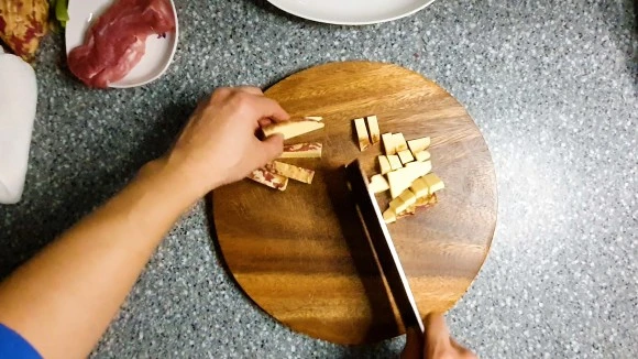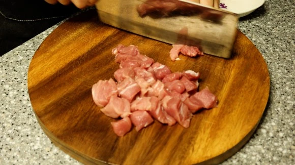 1. 고구마를 엄지손톱 크기로 깍둑 썰어준다. 당근도 고구마 크기로 썰고, 양파도 엄지손톱 크기로 잘라준다. 안심도 같은 크기로 잘라준다. 카레에 돼지고기 안심을 쓰게 되면 상대적으로 기름기가 적은 부위로 카레의 맛을 해지지 않는다.