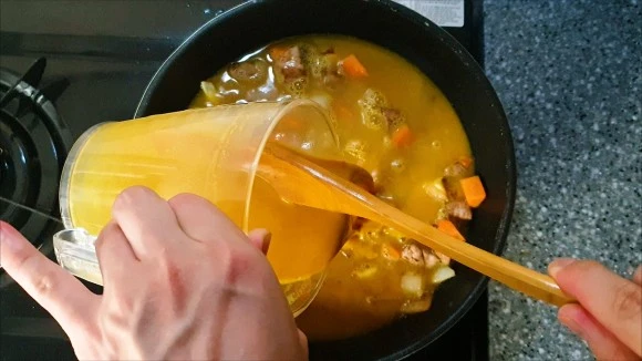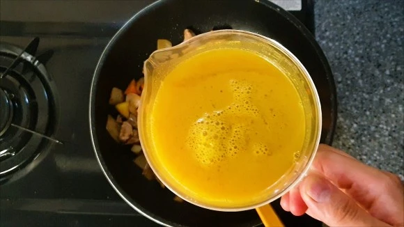 6. 카레 가루에 물 2컵 반을 넣어 개어준 후 복은 야채에 넣어준다. 침전물이 가라앉아 있으니 잘 섞어가며 부어준다. 팬에 바로 물을 붓고, 카레 가루를 넣어도 되지만 가루가 잘 풀리지 않고, 응어리질 수 있다. 가끔 카레를 먹다가 응어리진 카레를 먹고 인상을 찌푸린 경우가 있을 것이다. 카레 가루를 잘 풀지 않아서 생긴 것이다.