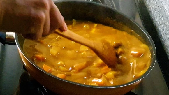 7. 카레가 가라앉아 팬 밑바닥에 눌어붙을 수 있으니 잘 저으며 끓인다.