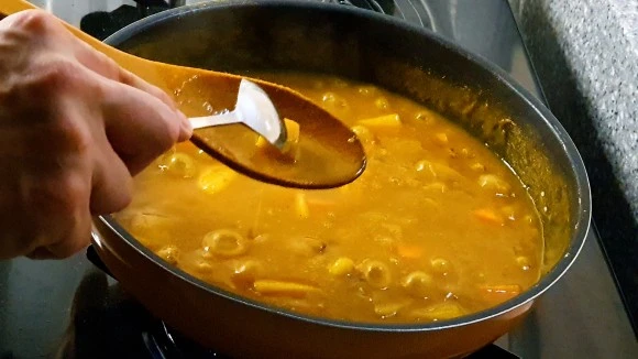 8. 카레가 끓으면 약 불로 줄여주고, 고구마가 익었는지 확인해 준다. 센 불로 계속 가열하면 수분이 증발해 간이 세질 수 있다. 고구마가 익으면 불을 끈다. 카레가 완성됐다.