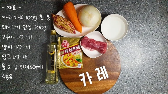 고구마 밥을 할 게 아니라면 카레에 고구마를 넣어 보아라. 카레의 짠맛과 고구마의 단맛이 단짠단짠을 입안 가득 채워 줄 것이다. 고구마 하나, 양파 하나, 당근 하나, 카레 가루 한 봉지, 돼지고기를 장바구니에 넣고, 집으로 향한다.