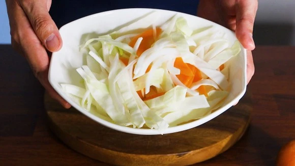 1. 양배추 80g을 새끼손톱 굵기로 채 썰어준다. 양배추는 순이 죽으면 양이 줄어들어 크게 썰어도 괜찮다.