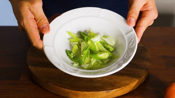4. 대파를 씻어 1/3개를 어슷 썰어 준다. 청양고추 1개도 어슷 썰어 대파와 섞어준다.