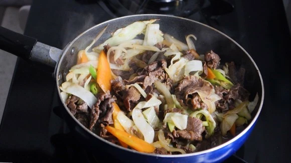 7. 팬에 기름 1 큰 술을 두르고 센 불에 고기를 넣고 양념장을 부어 볶아준다. 고기의 핏기가 없을 때까지만 볶으면 된다.
