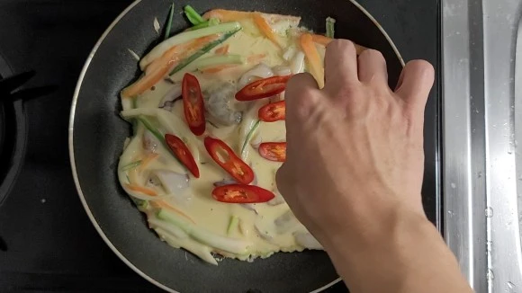 9. 프라이팬을 중 불에 올리고, 기름을 부어 달궈 준다. 달궈진 팬에 섞어 놓은 파전 반죽을 넣어 골고루 펼친다. 재료를 골고루 넣어주면 좋다. 반죽을 많이 넣어 전이 너무 두꺼우면 익는 시간도 오래 걸리고, 속까지 익히기 힘들므로 적당한 두께로 부쳐주면 좋다.
