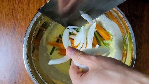 4. 양파 1/4개를 채를 썰어 마찬가지로 볼에 넣어준다. 양파 또한 다져서 넣어도 괜찮다.