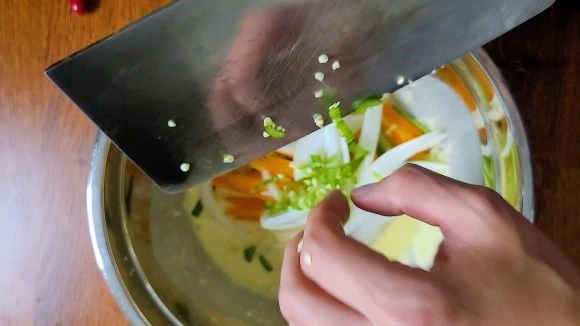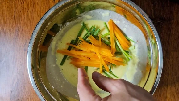 3. 당근 편 5개를 자르고, 채를 썰어 볼에 넣어준다. 얇게 썰어도 먹기에 좋다. 또는 다져서 넣어도 된다.