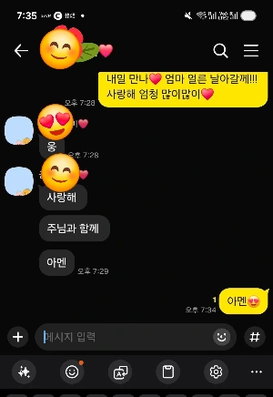 둘이 톡을 주고받다가 끝에 '주님과 함께'로 인사해 주는 딸이 대견해서