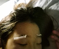 손녀가 일어나기 전 하얀 휴지를 눈썹 위에 붙여 놓고 장난을 했는데
