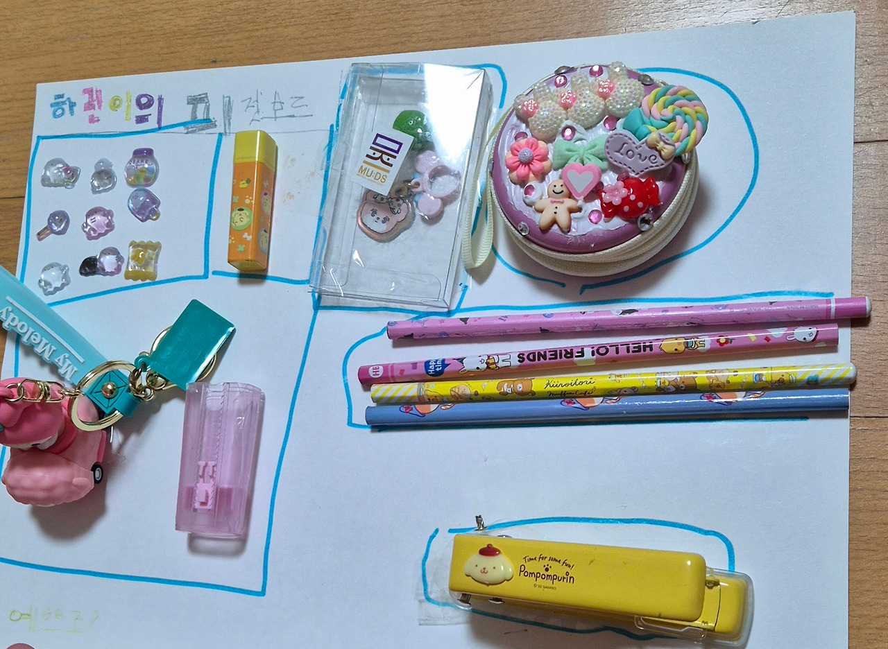 손녀가 도화지에 스티커도 붙이고 지우개도 붙이고 열쇠고리 등등을 붙이면서 무언가를 열심히 만들기에