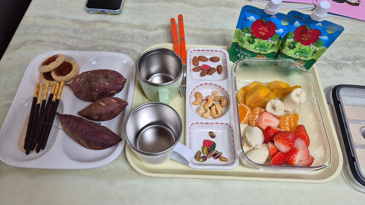 그러다 잠시 조용하기에 빼꼼 문을 열어보니 간식타임인 듯