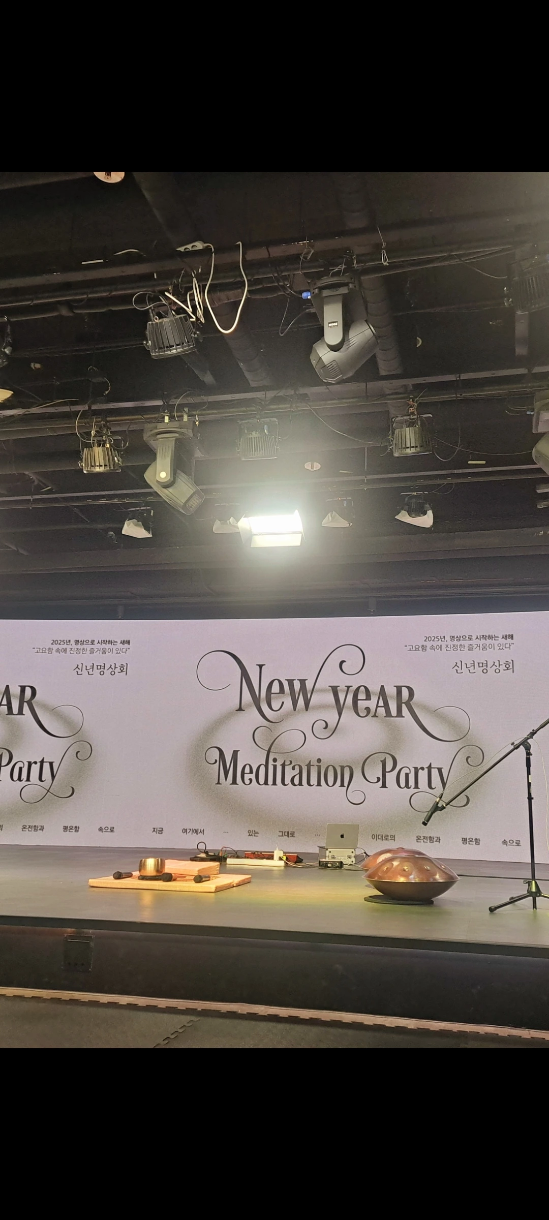 다 와서도 비슷한 건물들 사이에서 잠시 헤맸다.( 집안 대대로 길치... ) 그러다 지하 1층, 미리 와 있던 몇몇의 사람들과 입구에 걸린 커다란 현수막을 발견했다. "신년 명상회" ' New Year Meditation Party' 그 흘림체 영어문구가 얼마나 반가웠던지. 나는 조금 일찍 도착한 편이라 운 좋게 세 번째 줄에 앉게 되었다. 신발을 벗고, 설레는 마음으로 매트에 자리를 잡고 앉았다.