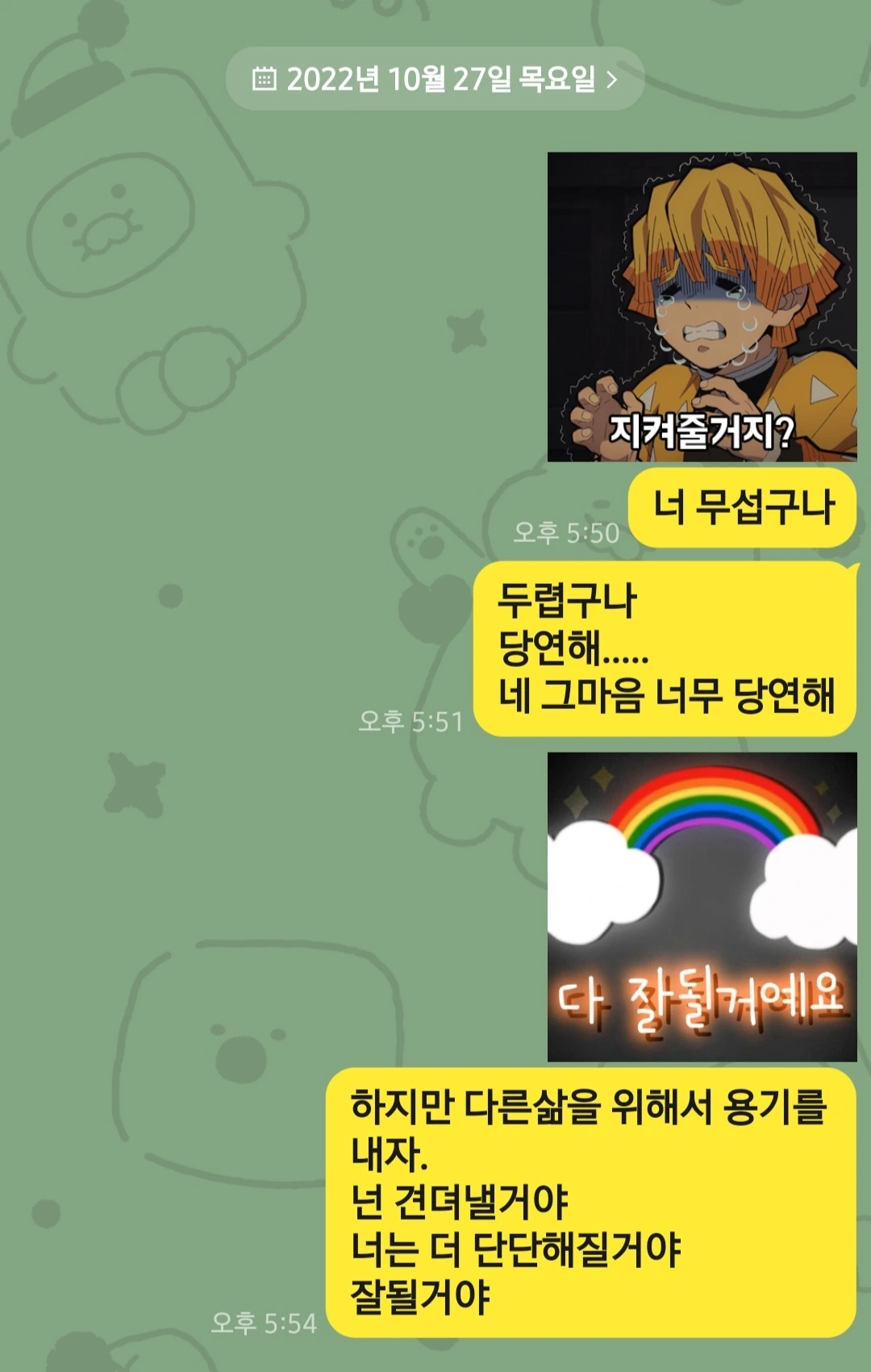 돌아보면, 오히려 " 이혼하겠다." 선택을 내리기까지가 정말 커다란 용기가 필요했던 거 같다. 스스로에게 카톡을 보내보기도 하면서 부들부들 떨리는 심장과 혼란스러움을 안정시켜 보느라 애썼다.