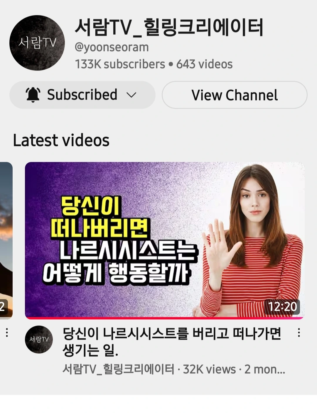 혹시라도 가족이나 지인 중에 나르시시즘이 강한 사람이 있어 고통스러운 상황이라면, 유튜브에서 <서람 TV>를 찾아서 영상을 찾아보길 강하게 추천한다. 남편이 분노조절장애가 아니라 나르시시스트라는 것을 그 영상들을 보면서 알게 되었기 때문이다. 가스라이팅, 후버링 등등 보이는 여러 태도로 나르시시스트라는 것을 확신한 뒤로 남편을 대할 때마다 몰아치던 두려움들이 대폭 사라져서 더 이상 피하지 않고 정면으로 대응할 수 있게 되었었기 때문이다.