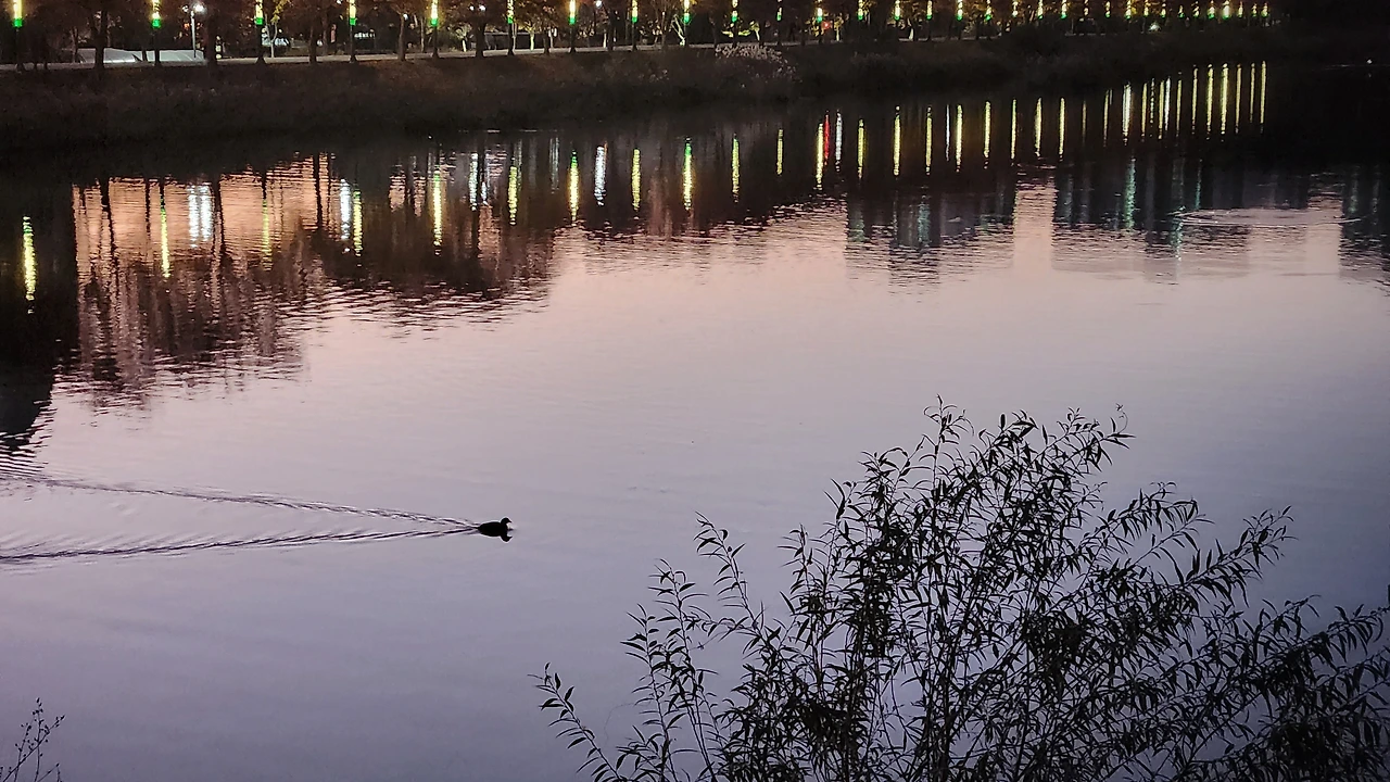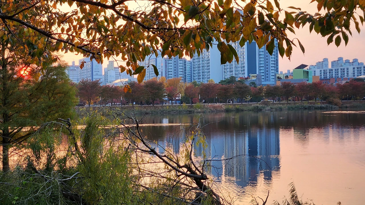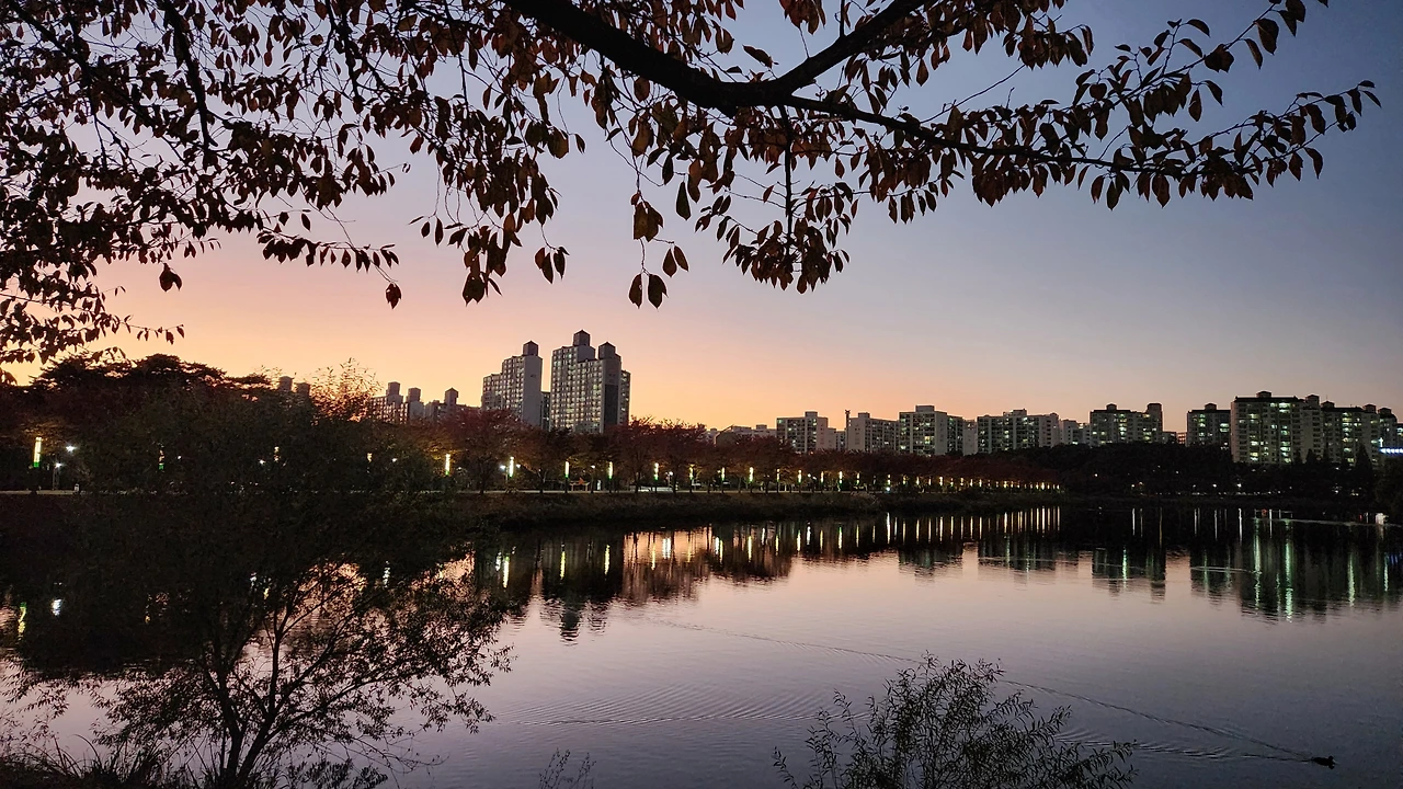 물에 비친 건물과 나무, 그리고 빛은 몽롱하다.