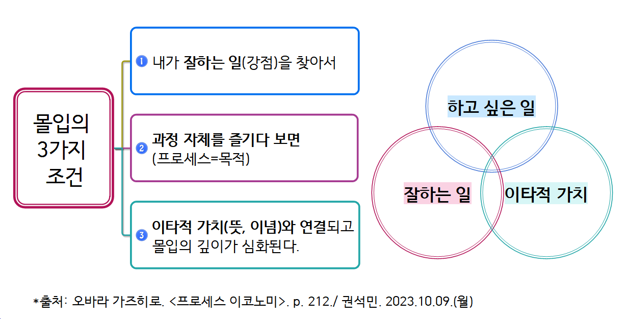 내가 잘하는 것을 찾아서, 과정(프로세스=목적)을 즐기면, 세상과 연결(가치, 뜻, 이념)되고 몰입의 깊이가 깊어진다. 잘하는 일, 하고 싶은 일, 이타적 가치 세 가지 교집합이 속하는 영역의 일이 뭐가 있는지 우리는 찾아야 한다. <프로세스 이코노미>의 저자, 오바라 가즈히로의 말이다.