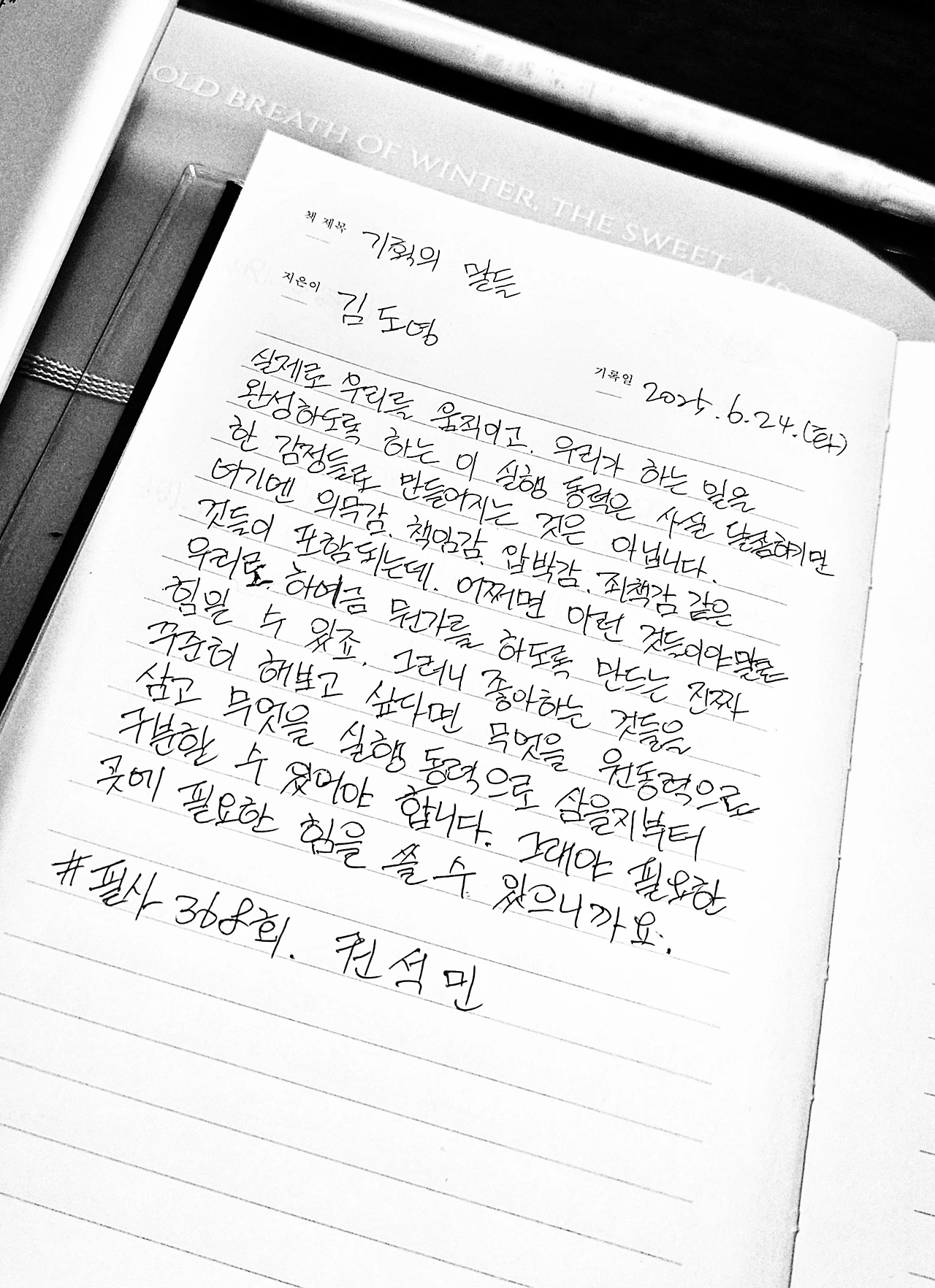 "하지만 원동력이 확보되었다고 해서 곧장 행동으로 옮길 수 있는 것은 아닙니다. 뭔가를 하려면 또 다른 의미의 힘, 바로 실행 동력이 필요하기 때문이죠. 실제로 우리를 움직이고 우리가 하는 일을 완성하도록 하는 이 실행 동력은 사실 달콤하기만 한 감정들로 만들어지는 것은 아닙니다. 여기엔 의무감, 책임감, 압박감, 죄책감 같은 것들이 포함되는데, 어쩌면 이런 것들이야말로 우리로 하여금 뭔가를 하도록 만드는 진짜 힘일 수 있죠. 그러니 좋아하는 것들을 꾸준히 해보고 싶다면 무엇을 원동력으로 삼고 무엇을 실행동력으로 삼을지부터 구분할 수 있어야 합니다. 그래야 필요한 곳에 필요한 힘을 쓸 수 있으니까요." p. 193.