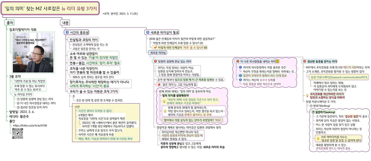 김호 더랩에이치 대표가 폴인(folin)에서 인터뷰한 자료를 봤다. 김호 작가님의 책 <직장인에서 직업인으로>와 <그렇게 질문하면 원하는 답을 들을 수 없습니다>을 읽었고, 세바시, 윌라 등을 통해 강연을 접했었다. 칼럼을 읽고 마인드 맵(씽크와이즈 활용)으로 정리하기도 했다. 몇 번을 반복해서 말씀을 접해도 늘 새롭게 다가온다. 폴인(folin)에서 2023. 3. 6.(월) 황은주 에디터가 발행한 내용을 요약하고 생각을 더했다.