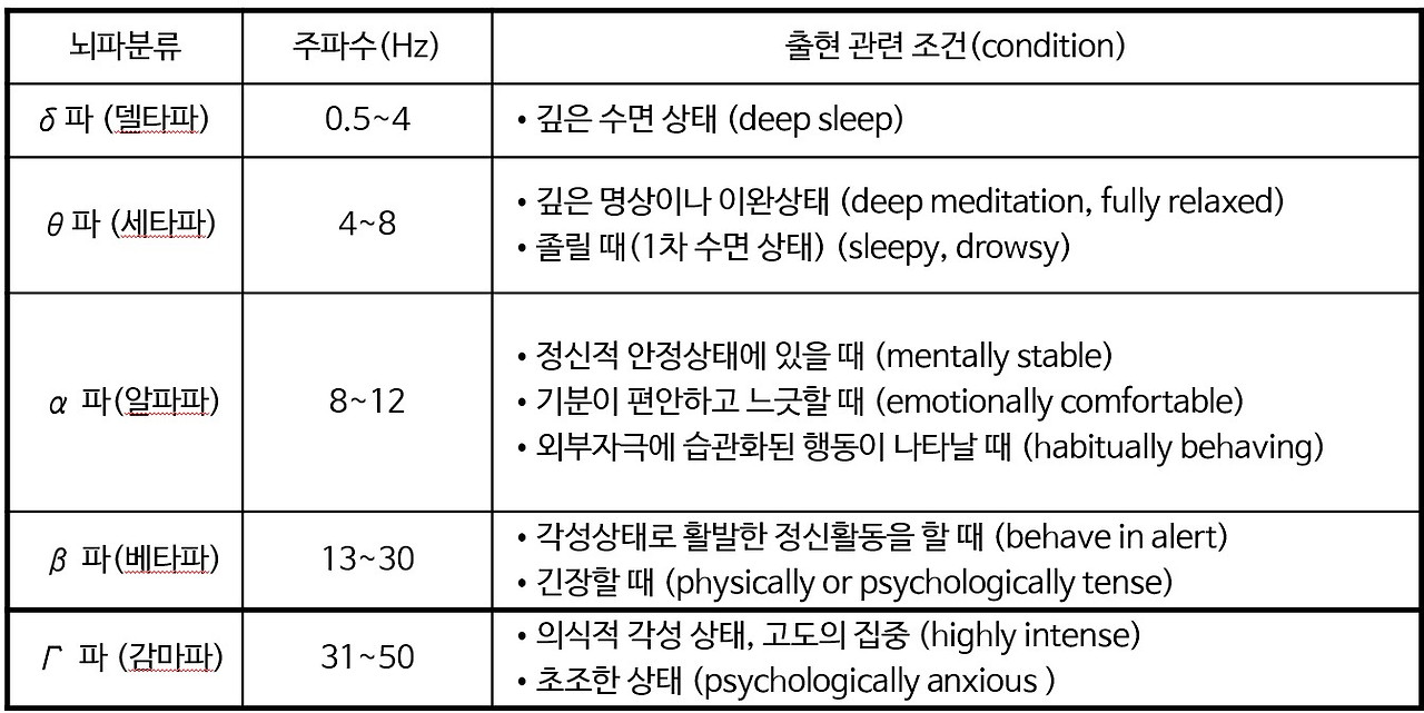 아래 표는 뇌파 주파수 대역범위에 따른 심리적 특징을 요약한 것입니다. 참고 서적마다 대역별 주파수 기준의 미세한 차이가 있습니다.