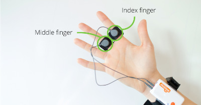 아래 그림의 측정기에서는, 손에서 미량의 땀이 발생해도 피부표면의 전기 흐름이 많아지는 것을 관찰할 수 있습니다. 이것을 피부전도도 (Skin Conductance Response: SCR)라고 부르고, 사람이 초조하거나 긴장한 상태를 읽어낼 수 있습니다.