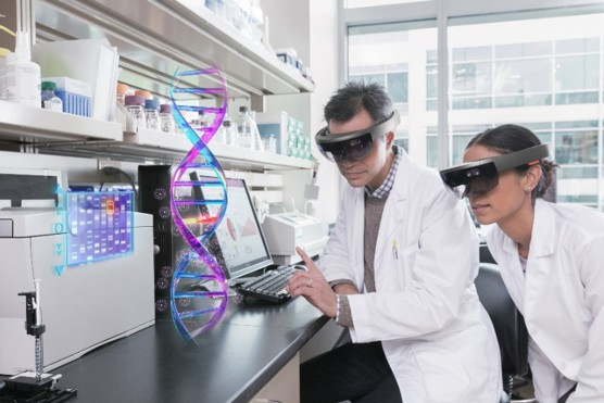 컴퓨터 시뮬레이션으로 만들어 진 유전자 구조를 3D 공간에서 관찰하는 장면