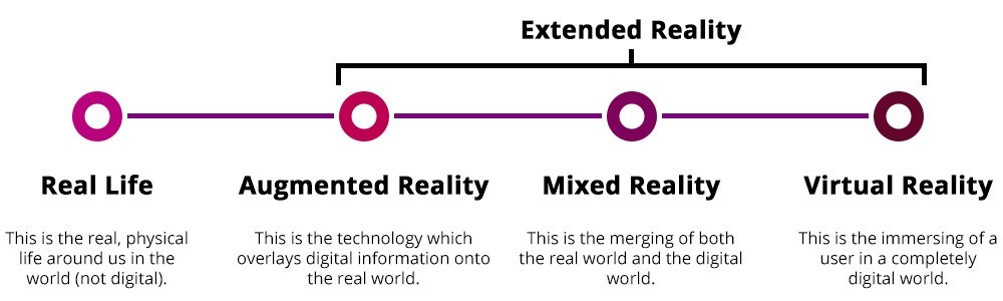 이 가상세계 속에는 나의 아바타(avatar)가 필요합니다. 나의 아바타는 VR세계에서 내가 만든 정체성을 가지고 수많은 경험을 합니다. 인간의 욕망이 무한대로 실현되는 세계입니다. VR은 과연 우리에게 새로운 메타버스 세상을 열어 줄까요? 아니면 단순한 3D 영상 기술로 남을까요? 다음 그림은 확장 현실(extended reality)의 단계를 보여줍니다.
