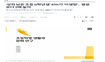 최근 기사를 봤다. 경기도교육연구원에서 <초등학생의 생활과 문화연구>라는 주제로 발표한 보고서의 결과였다. 결과는 충격적이었다. '성적 낮은 초등 6학년생' 41%가 '이생망'(이번생은망했다의 줄임말)라는 생각을 한다는 것이다. '고등학생도 아닌 초등학생이 이런 생각을' 이라고 의심하면서 여러 차례 동일 기사를 읽고 또 읽었다. 분명 초등학생을 대상으로 한 연구였고 결과도 초등학생의 답변으로만 이루어진 것이었다. 무엇이 이 아이들을 이렇게 만들었나를 말하자는 게 아니다. 어쩌면 나도 부모로서 은연 중에 이런 생각을 내 자녀에게 심어주고 있지는 않았나 돌아보게 된다. 아니 필시 분명 그런 의도는 아니였지만 그랬다.