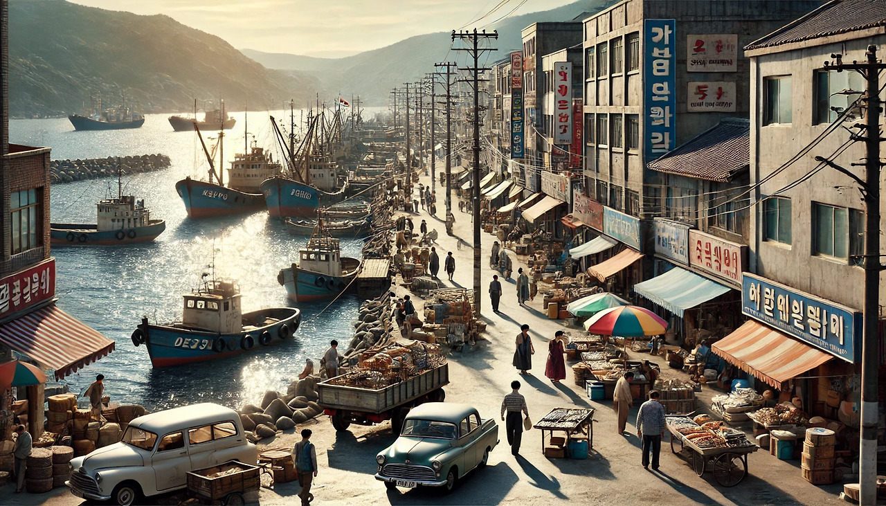 아침의 덕포는 바다 위로 은빛 햇살이 깔리며, 물결이 잔잔하게 반짝입니다. 부두에는 어민들이 새벽 조업을 마치고 돌아와 고깃배에서 고기를 내리고, 갓 잡은 생선들의 비늘이 햇빛을 받아 반짝입니다. 갈매기들이 하늘을 맴돌며 물고기 냄새를 쫓고, 짙은 소금기와 함께 비릿하면서도 신선한 바다 내음이 항구에 가득 차 있습니다.