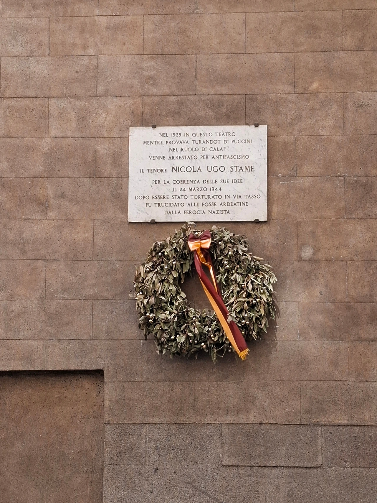 1939년, 이 극장에서 푸치니의 오페라 「투란도트」에서 칼라프 역을 연습하던 중, 테너 니콜라 우고 스타메는 반파시즘 활동으로 체포되었다. 그의 신념에 대한 일관성으로 인해, 그는 1944년 3월 24일 비아 타소에서 고문을 받은 후 나치의 잔혹함에 의해 포세 아르데아티네에서 처형당했다.