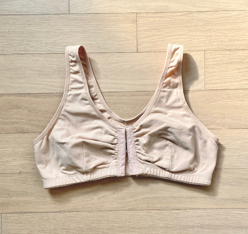 수술 후 당분간은 고정과 압박을 위해 병원에서 준 부드러운 촉감의 탄력이 짱짱한 레저브라를 착용해야 하기 때문에 속옷 고민을 하지 않아도 됐다. 앞 훅이 이렇게 편할 줄이야~ 간호사님이 S 사이즈가 맞을 거 같다며 주셨고, 나 역시 그럴거라 생각하고 받은 S가 생각보다 커서 그대로는 제 기능을 못했다. 압박이 안 돼 지지도 못했고, 몸통 둘레도 커서 심하게 휘휘 돌아갔다. 오래 입을 것도 아닌데 새로 사기도 그렇고 해서 방도를 찾다가 등판을 손바느질로 꿰매서 가슴둘레는 줄이고, 패드를 넣어 압박이 될 수 있게 했다. 평소 같으면 무지 답답했을 테지만, 단단히 잡아주지 않으면 움직일 때 통증이 따라왔고, 누적된 통증이 밤에 몰려왔기 때문에 답답함은 ’그까짓‘이 되었다.