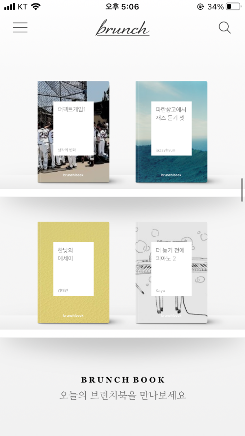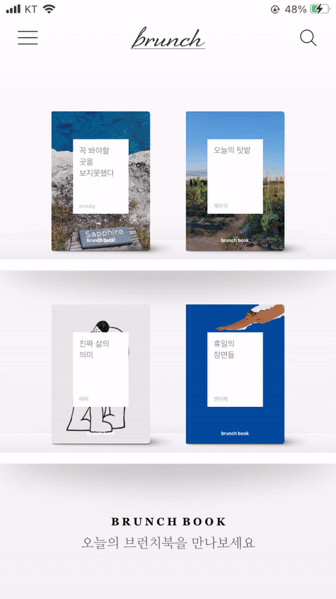 브런치는 상대적으로 로딩이 긴 '브런치 북'을 로딩할 때는 기다리는 사용자가 지루하지 않게 북 커버에서 책을 꺼내는 모션을 이용해야 사용자에게 로딩시간을 지루하지 않게 제공한다. 개인적으로 브런치의 심미적인 선택이 돋보이는 세심한 UI라고 을 생각을 하는데, 단순히 로딩화면 노출하여 사용자를 기다리게 하는 것이 아니라, 책장에서 책을 꺼내는 듯한 모션을 넣어 심미적으로 자신의 브랜딩 이미지까지 챙겼다. 사용자가 정말 하나의 '고급진 책 한 권'을 집어든 것 같은 경험을 제공해 준 것이다.