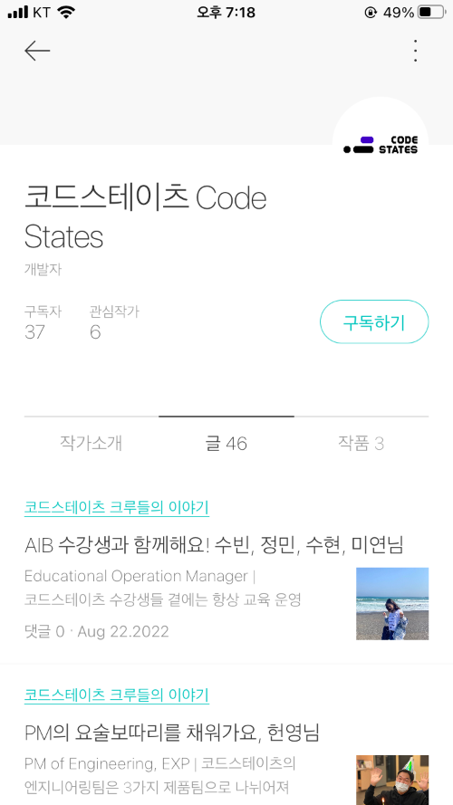 독자 입장에서 작가의 프로필을 들어갔을 때 상황이다. 브런치는 기본적으로 블랙앤화이트 라는 심플한 톤을 구축하고 있는데, 프로필 버튼의 '구독하기' 만 민트톤으로 만들었다. 서비스 입장에서 작가의 프로필에 구독을 유도하기 위해, 일부러 사용자 인지가 잘 되게 눈에 띄는 민트톤으로 만든 것으로 보인다.