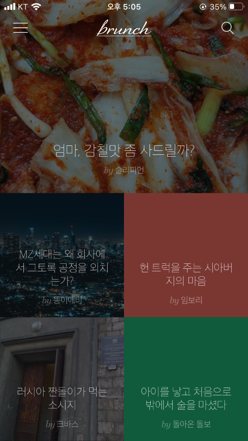 브런치가 큐레이션 하는 홈화면 중에 가장 많은 갯수인 5개 추천의 화면 배치입니다. 밀러의 말에 따르면 사람들은 7개의 정보기억까지만 기억한다고 합니다. 그런고로 브런치의 추천 화면 갯수는 그보다 더 적은 숫자인 5개를 유지하고 있습니다.