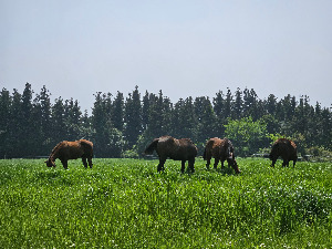 나는 제주의 바다와 해변의 검은 바위들, 그리고 틈틈이 해조류가 자라며 물이 빠지면 보이는 초록 바위들도 좋아하지만 섬의 중앙으로 달리다 보면 만나는 푸르름도 좋아한다. "헐, 말이다!!" 매번 올 때마다 한 번씩 보게 되는 말들이지만 왜 이렇게 늘 신기하고 반가운지. 나는 동물을 정말 좋아하는데, 혼자 왔을 때는 다른 사람 눈치를 보지 않고 몇 시간이고 돗자리를 깔고 앉아 목장의 말들이 뛰는 모습을 바라보기도 했다.