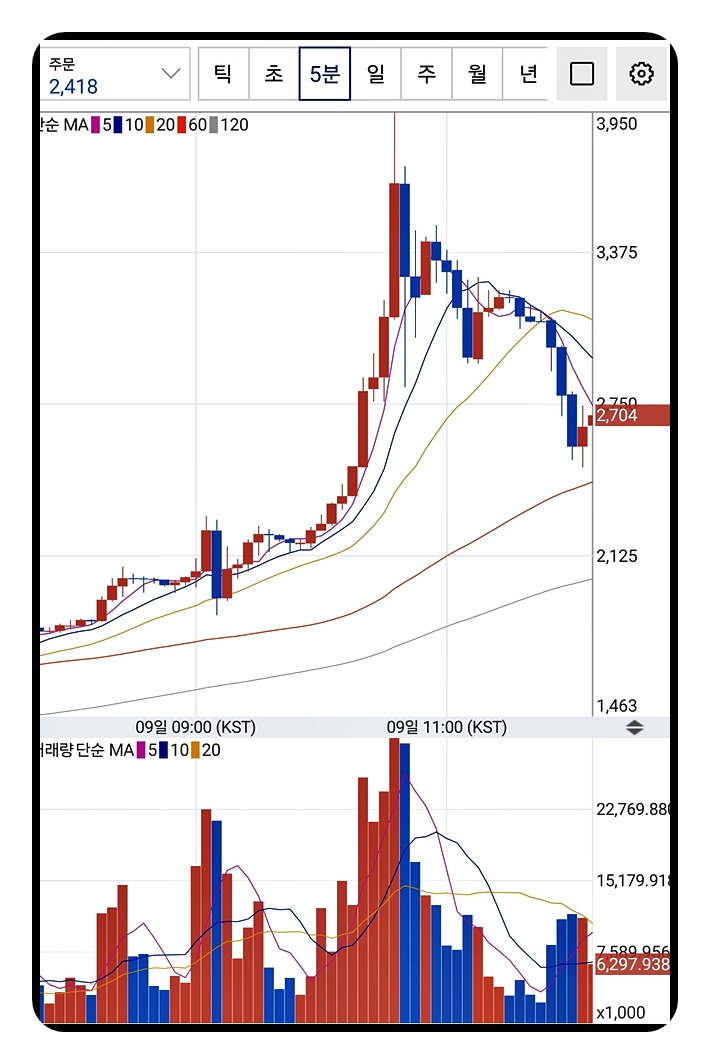 이제 끝났다고 생각했던 코인은 다시 몇 시간 뒤에 2600원대로 거진 새벽 1시쯤 다시 치솟기 시작합니다. 투자자들은 다시 빔이 시작된 것으로 판단하고 무리하게 높은 금액대에 진입하게 됩니다. 이때는 이 코인이 원래 700원이었다는 사실을 망각하게 됩니다. 아예 인지를 못하게 되죠.