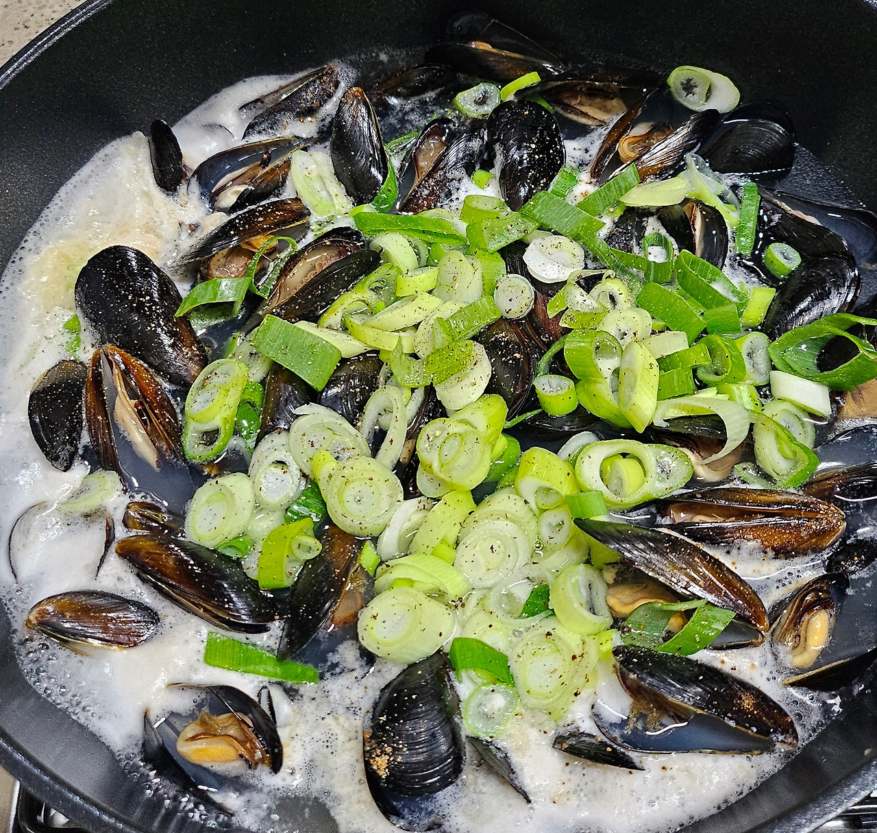 홍합은 고무장갑 끼고 팍팍 문질러 여러번 닦고 수염처럼 나온 부분을 당겨서 빼주시면 일단 요리의 반은 끝났답니다. 파, 마늘, 청양고추, 소주 없으면 미림, 소금 조금 넣고 끓이면 완성이에요.