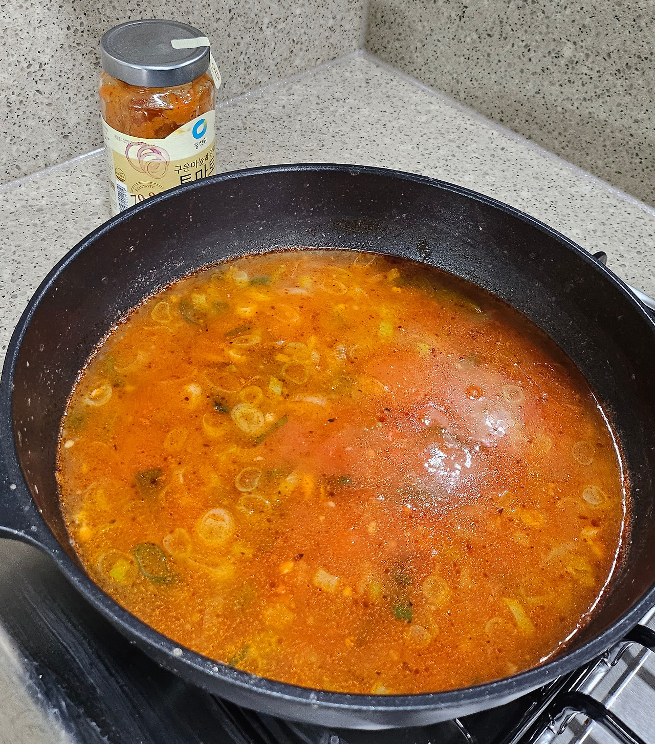 홍합탕 먹고 남은 홍합을 분리해서 양파랑 토마토소스 치킨스톡 넣으면 맛있어요. 처음에 청양고추를 넣어서 더 칼칼한 홍합스튜가 된 것 같아요.