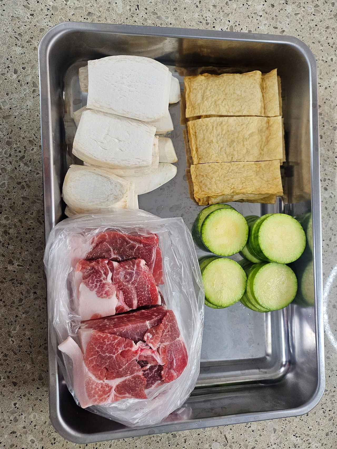 언제 샀는지 모를 반쯤 남은 애호박, 구석에 자리 잡고 있던 돼지고기 한 팩. 푸석푸석해진 어묵, 새송이 버섯은 벌써 노란 옷으로 갈아입으려 했어요. 한때는 신선했던 재료들이 조금은 무심한 시간 속에서 시들어 가고 있었답니다.