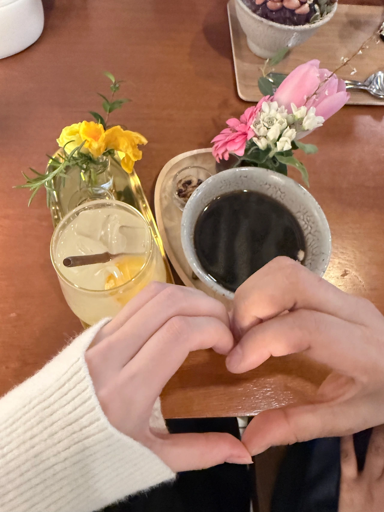 리듬감 있게 걸으며 꽃향기 가득한 어느 고즈넉한 전통 찻집에 도착했습니다. 따뜻한 차 한 잔을 사이에 두고 우리는 평소 나누지 못했던 작은 이야기들을 도란도란 나누었습니다. 딸아이와 '손하트'를 만들어 사진을 찍는 순간, 깔깔거리며 사진을 찍는 내 모습이 마치 단짝 친구들과 수학여행을 온 여고생처럼 느껴졌습니다.