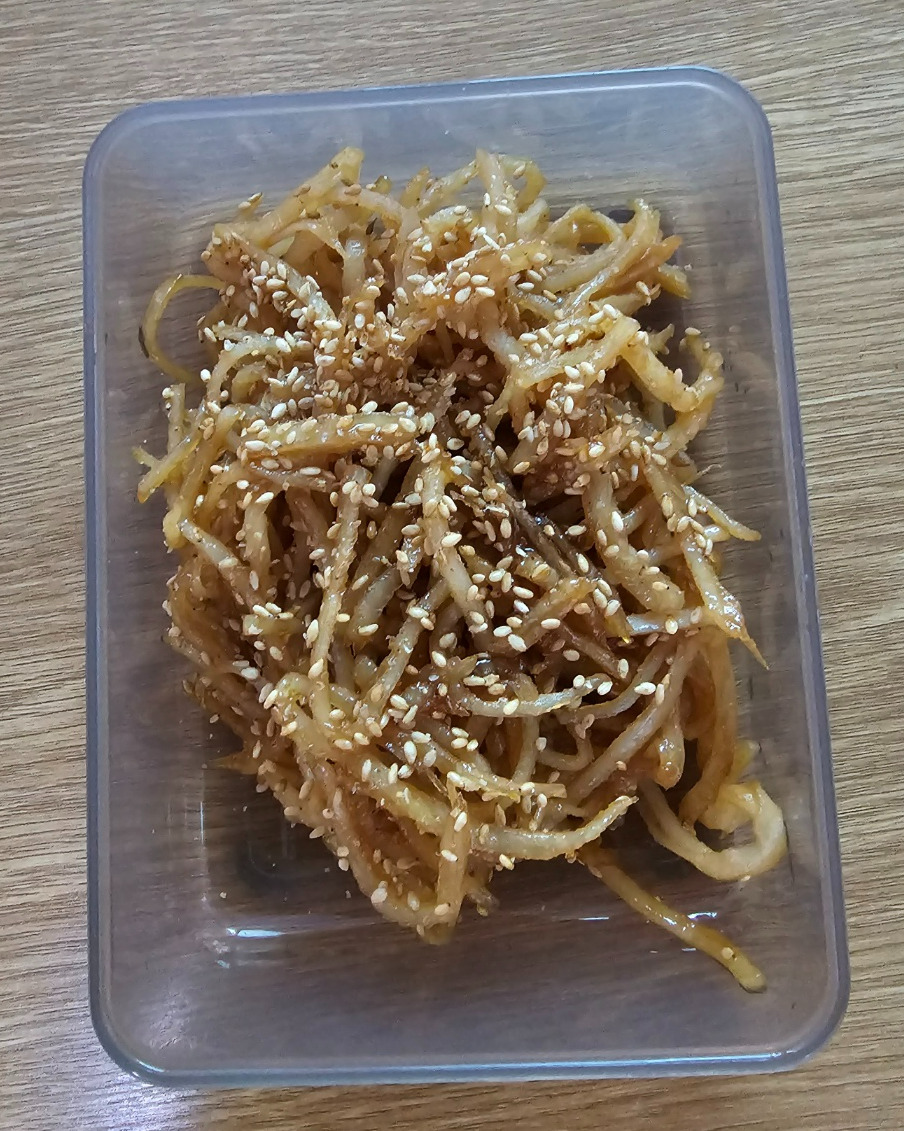 미역냉국을 만들려고 냉장고를 열었더니 양파와 냉면육수밖에 없네요. 미역과 냉면육수, 양파와 깨면 충분합니다. 미역은 물에 불려주고 꼭 짜주세요. 생미역이 비린내는 마늘이 잡아주니까 걱정 마세요. 마늘, 국간장, 설탕, 참기름을 넣고 미역을 조물조물 무쳐주세요. 벌써 요리는 끝났답니다. 양파와 냉면육수 넣고 큼직한 얼음만 넣으면 달달하고 새콤한 미역냉국이 완성되었어요. 오늘은 미역냉국을 시원하게 보온병에 담아주고 간장 오징어채볶음. 파김치, 가지나물, 파프리카와 당근을 싸주었어요.