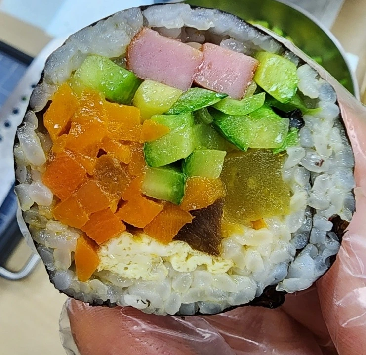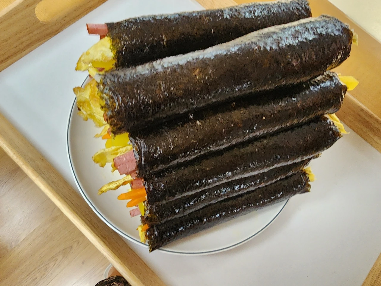 생각보다 뚱뚱이 김밥이 되었네요. 각자 취향에 맞는 김밥을 싸 보기로 했어요. 중년에 부부는 애호박만 듬뿍 넣어 먹어보고 청소년들은 당근을 듬뿍 넣어 먹어보았답니다. 신랑이 자기 도시락은 스스로 준비한다며 김밥을 예쁘게 말아서 도시락 완성했어요. 재료만 준비하니까 자신 없는 김밥도 서로 자기 마음대로 싸 먹을 수 있어서 편하답니다.